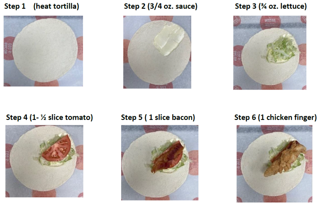 • Use a squeeze bottle to apply ¾ oz. Ranch diagonally on the top right corner of tortilla – 10 lines