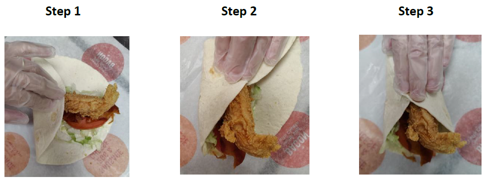 1. With the product diagonal (corner to corner) on center of wrap, fold the bottom left corner of the paper wrap about halfway up until it touches the tortilla