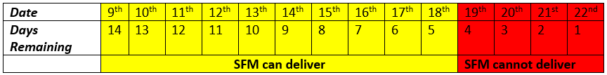 For example: If you have received a case of raw chicken fillet breast with an expiration date of the 22nd, you could not receive the case of chicken after the 18th. See chart below.